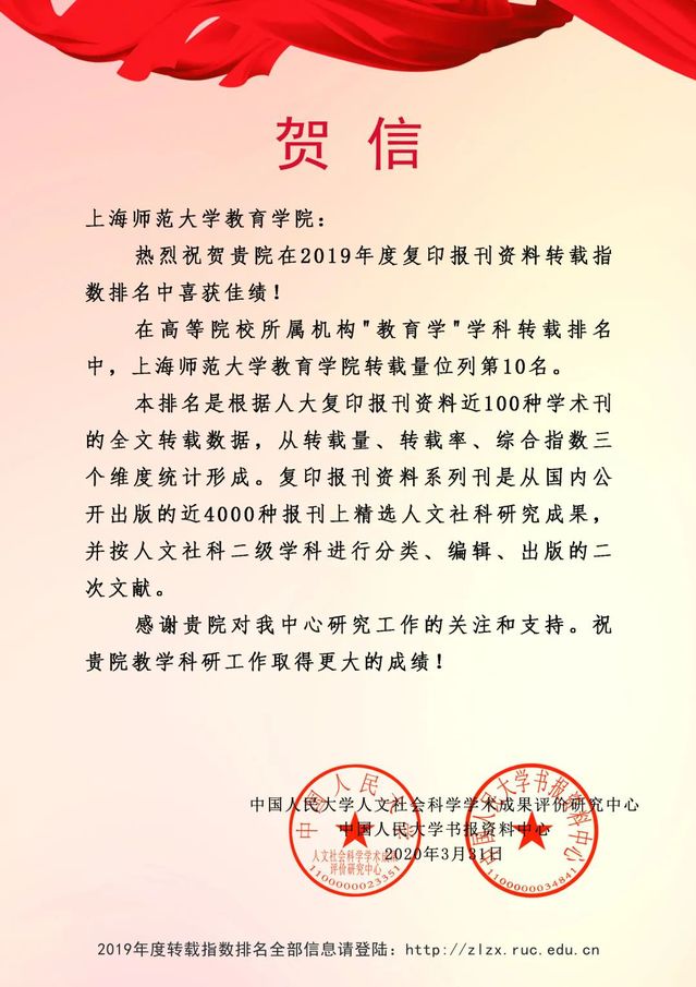 日前,中国人民大学人文社会科学学术成果评价研究中心正式发布了2019年度复印报刊资料转载指数排名和复印报刊资料重要转载来源作者,在高等院校所属机构“教育学”学科转载排名中,我院转载量位列第10名。
