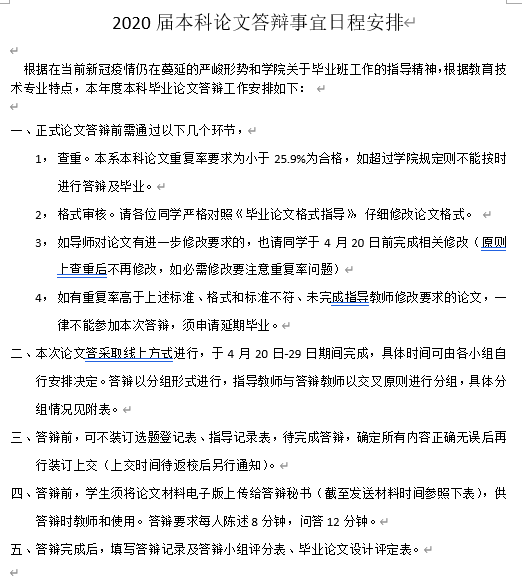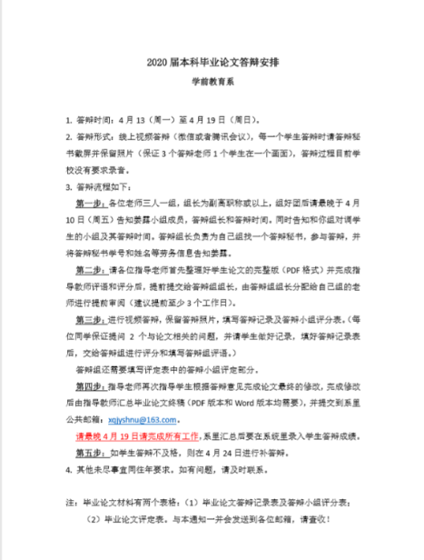 教育技术系制订了《2020届本科论文答辩事宜安排》,明确了本次论文答辩的目标、程序、分组人员和材料提交等各方面要求,并下发给所有参加答辩的教师、学生和答辩秘书。