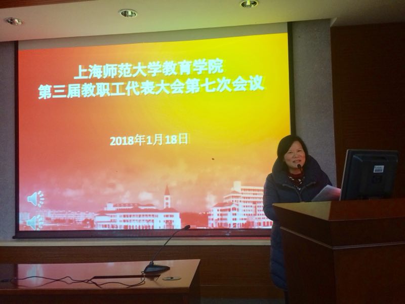 2018年1月18日上午在徐汇校区第四教学楼B101室,教育学院召开了第三届教职工代表大会第七次会议,代表们认真听取了夏惠贤院长所作的《教育学院2017年度行政工作报告》等,随后,分组进行了热烈的讨论和审议,并且对如何营造学院学术氛围和加强教学工作提出了较好的意见和建议,最后,党委书记徐晓明做了总结,对未来工作提出了要求。